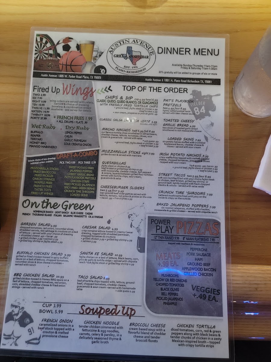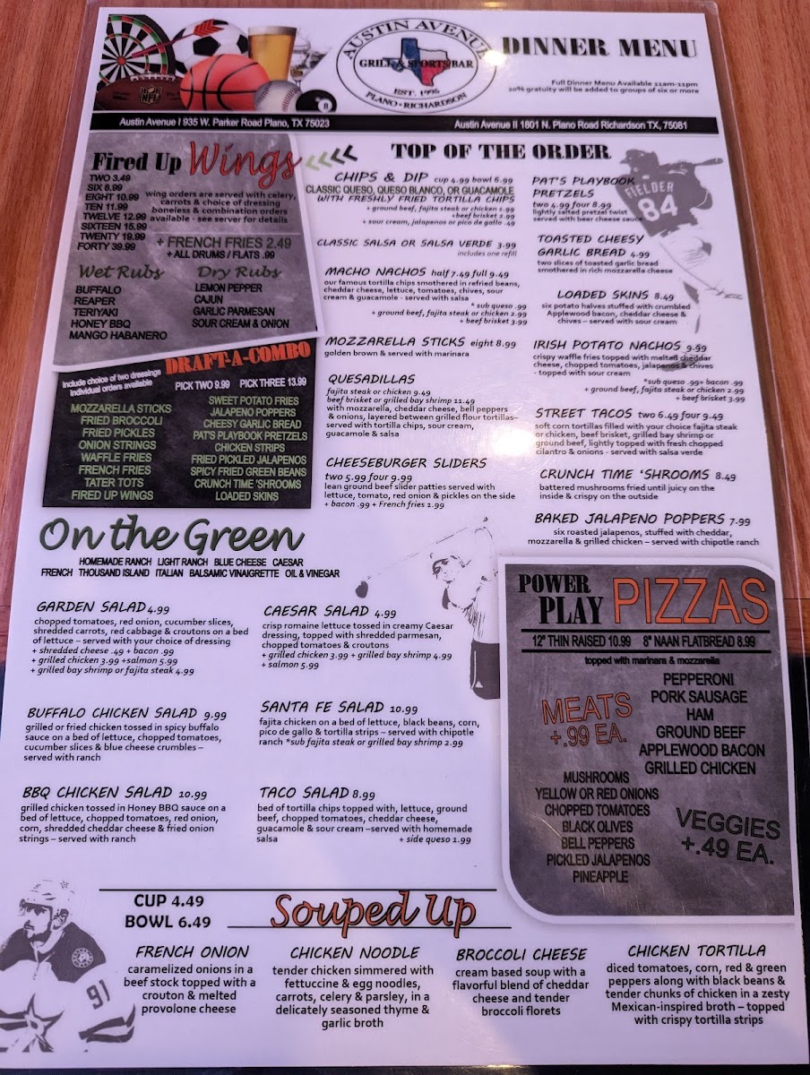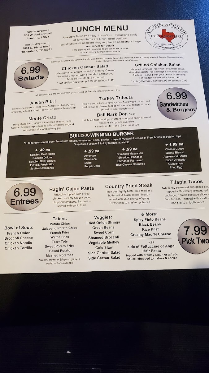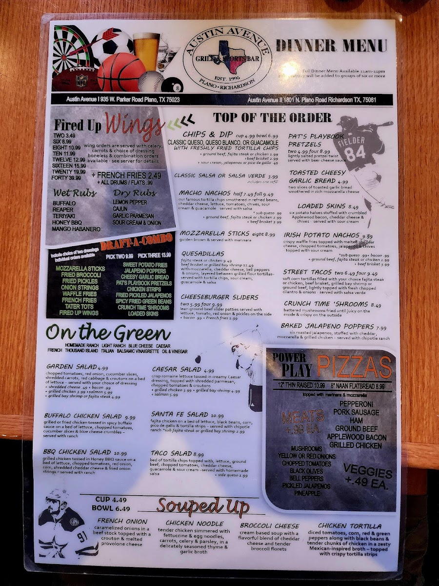 Welcome to Austin Avenue Grill & Sports Bar—a culinary gem nestled in Plano, Texas. Here, the menu is as rich and diverse as the vibrant atmosphere. Start with crisp Buffalo Chicken Salad, featuring tender boneless buffalo chicken drizzled with creamy avocado ranch dressing, or enjoy the hearty Sante Fe Salad piled high with fajita chicken, black beans, and corn.